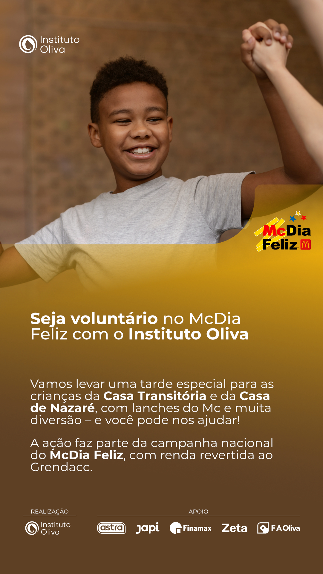 A atuação em rede, de fato, reflete o poder da empatia e da solidariedade e, principalmente, reforça que unidos conseguimos transformar realidades. O Instituto Oliva participou do McDia Feliz - uma das maiores campanha do país em prol do tratamento oncológico de crianças e adolescentes. Além de apoiar a causa, a ação beneficiou o GRENDACC Jundiaí – Grupo em Defesa da Criança com Câncer – e, por meio do Voluntariado, mais de 60 crianças de 2 Casas de Acolhimento – a Casa Transitória e a Casa de Nazaré, ambas em Jundiaí. Uma tarde de sábado que se tornou muito especial, para as crianças e para os voluntários. Confira as informações: